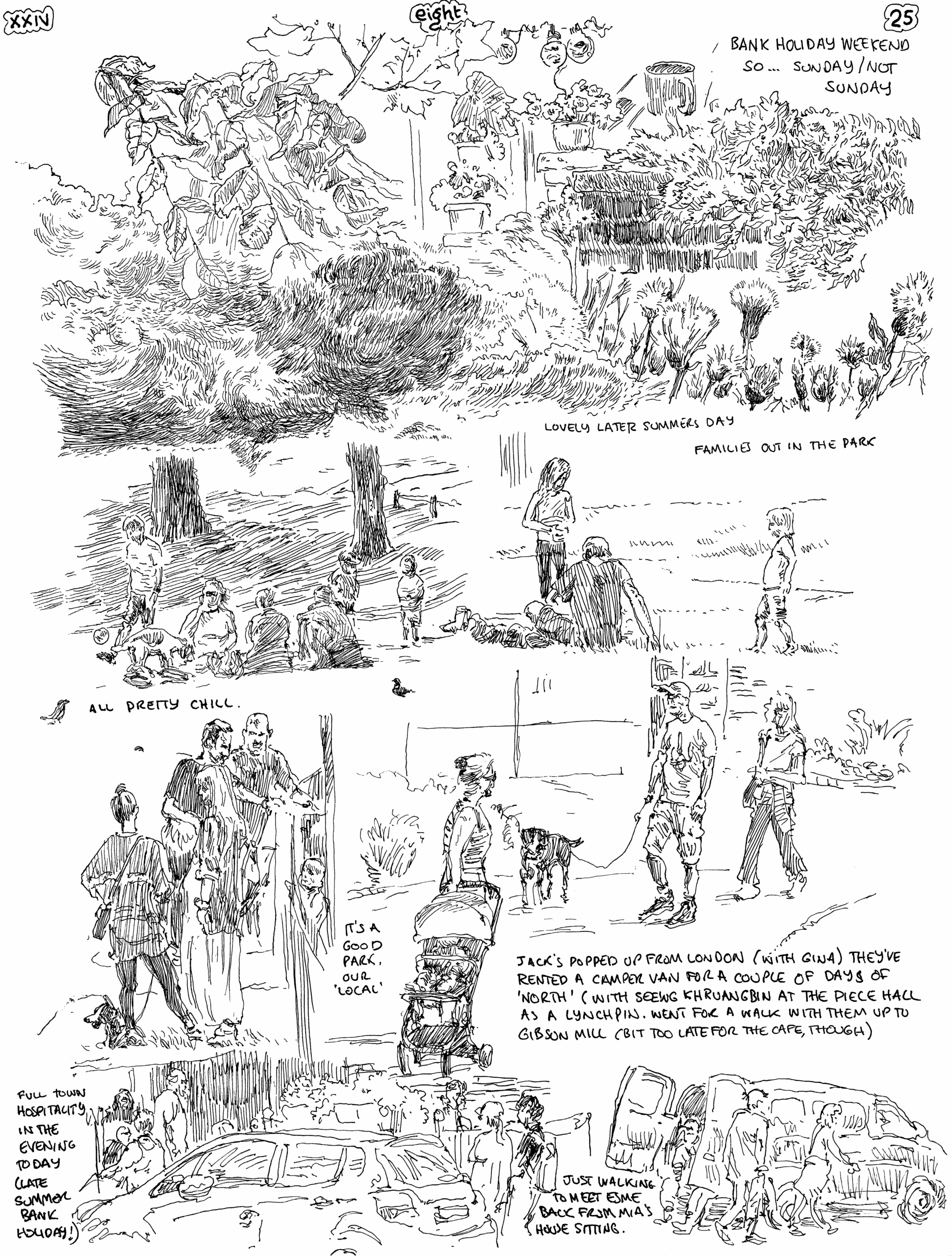 SundayComic: comic drawn on Sundays from Life and photo-reference. Well, we thought we might get up early in case Jack & Gina might  drop by, but we didn't & they didn't so that was all fine.  A nice morning walk around the park & there were quite a lot of people (families) out so that was good to see.  Esme went out to see Mia (first time they've met up for a while now) & while she was out I made Louise & I iced mochas (shaken in a stainless steel vacuum flask I have) & it seems I did alright... so I made mochas for Jack & Gina as they dropped by shortly thereafter.  Filled up their water for the camper van & they were off again as they're enjoying themselves at a gig in Halifax tonight.