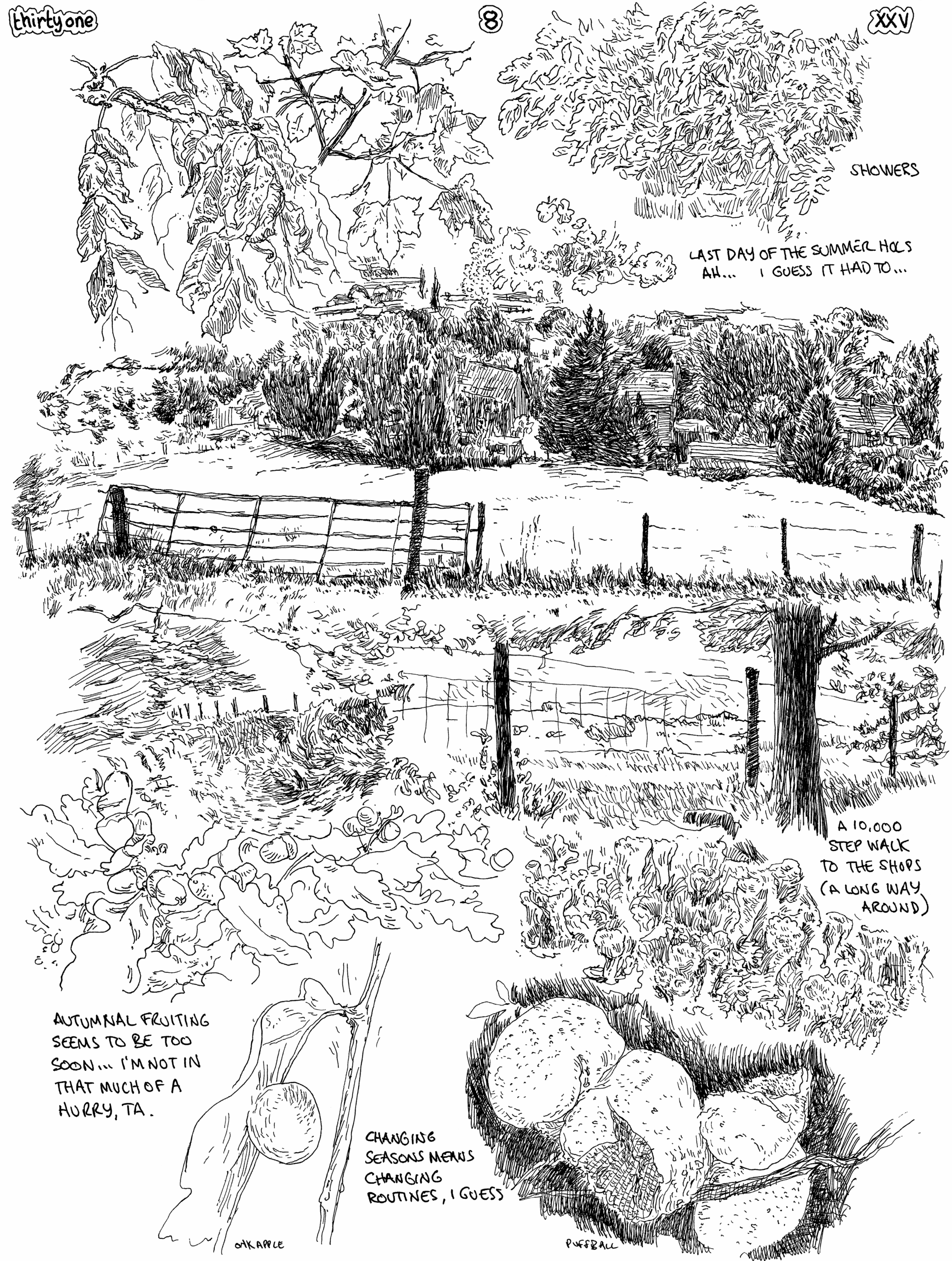 SundayComic: comic drawn on Sundays from Life and photo-reference. yes, yes; changing seasons & all that. Ticking along, happily enough.  Eve is traveling up this evening/night as she has a dental appointment from a while back, arriving tomorrow in the next town over.  At home Esme wanted to do a Sunday lunch (veg, veggie sausage, & & veggie gravy).  Eve will be too worn to to have her portion when she arrives.